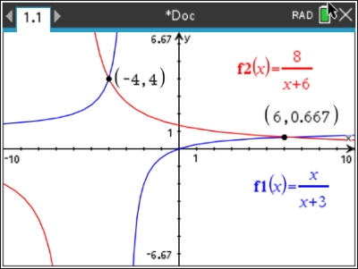 Hint: When working with rational equations, it may be difficult to "see" the intersection point if the viewing window is a small representation of the graph.
