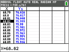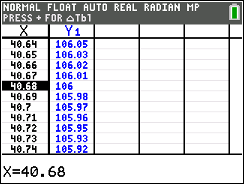 TABLE (above GRAPH) and arrow up or down to find your desired temp of 106º, in the Y1 column.